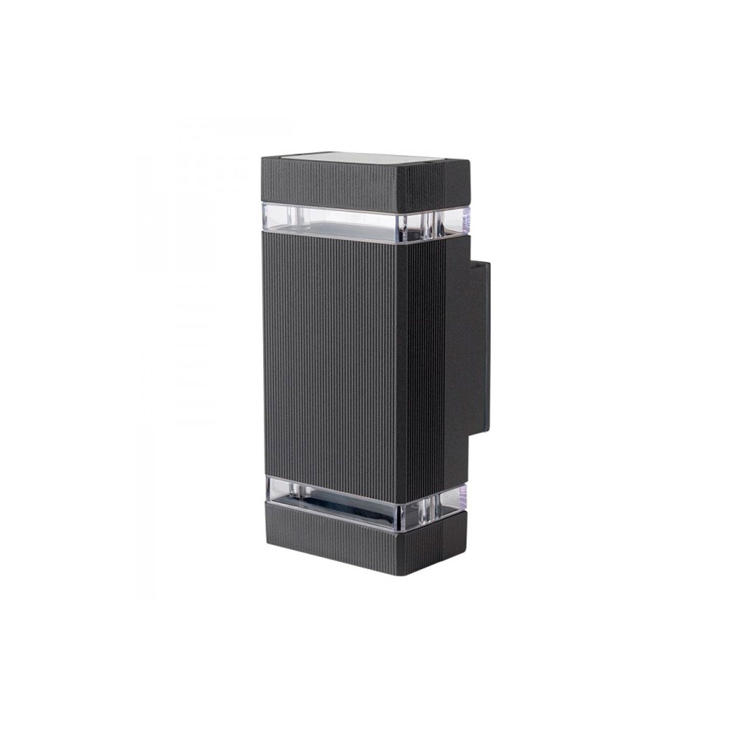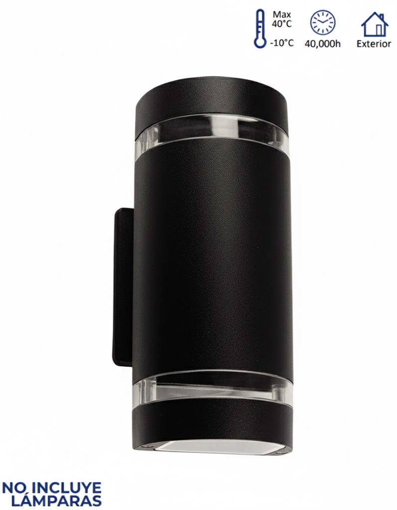 Con espacio para dos focos GU10 (no incluidos) y una apertura de haz de hasta 90° por cada dirección (arriba y abajo), esta luminaria crea un atractivo efecto de luz vertical que realza los detalles del entorno. Fabricada con materiales duraderos como aluminio, plástico y policarbonato, y con protección IP44, es resistente a salpicaduras de agua y adecuada para espacios exteriores protegidos como terrazas, pasillos, entradas o patios techados.