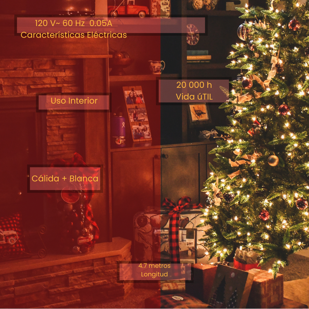 Perfecta para árboles de Navidad, ventanas, fachadas o interiores, esta serie de 4.7 metros ofrece una iluminación envolvente que realza cada rincón de tu hogar. La combinación de luces cálidas y blancas brinda un brillo suave, ideal para disfrutar momentos inolvidables en familia.