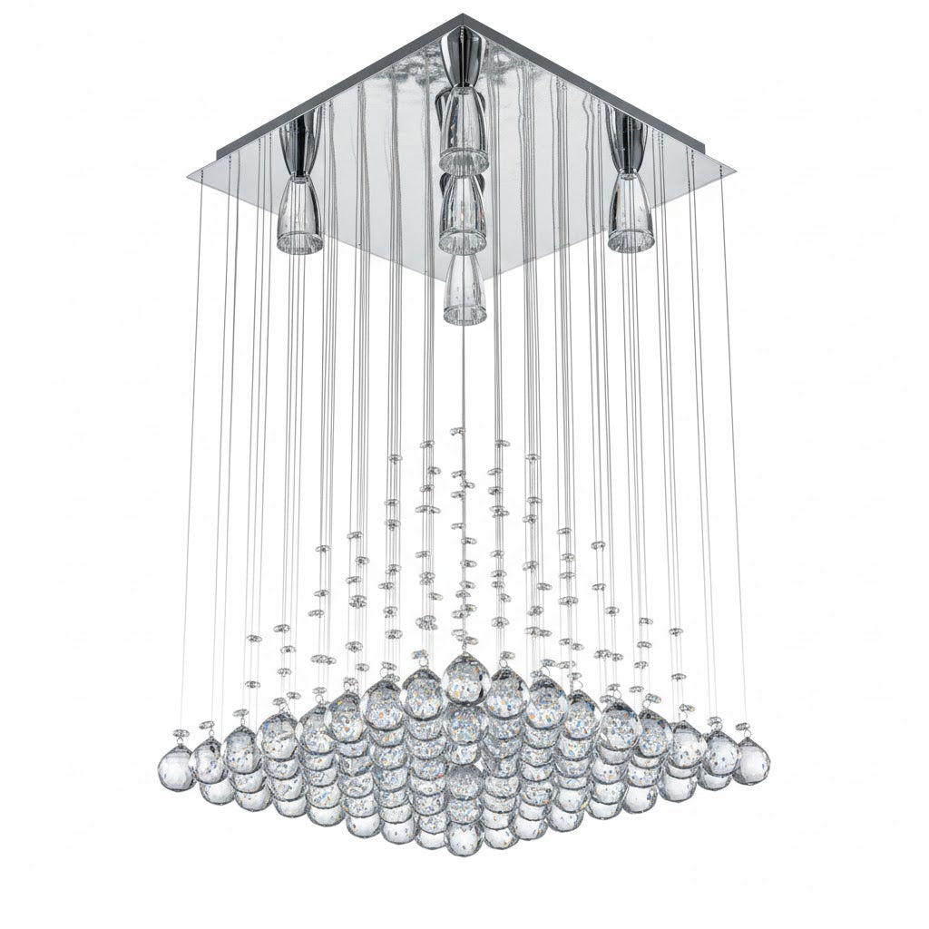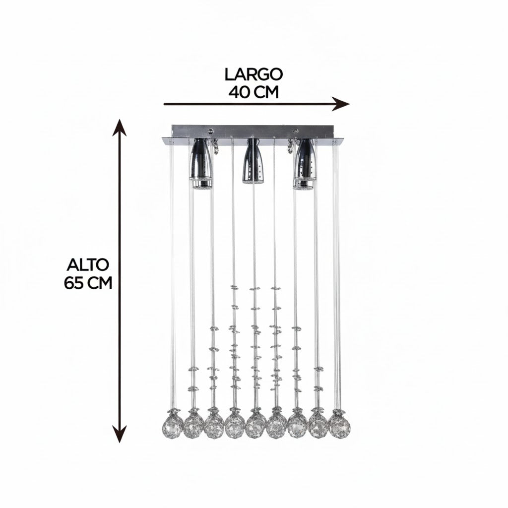 Diseñado con una imponente estructura en forma de pirámide de 40x40x65 cm, este candil está completamente revestido de cristales de alta calidad que refractan la luz de manera espectacular, creando un ambiente cálido y brillante. Su diseño geométrico y elegante se adapta perfectamente a estilos de decoración contemporáneos, glam o minimalistas de lujo.